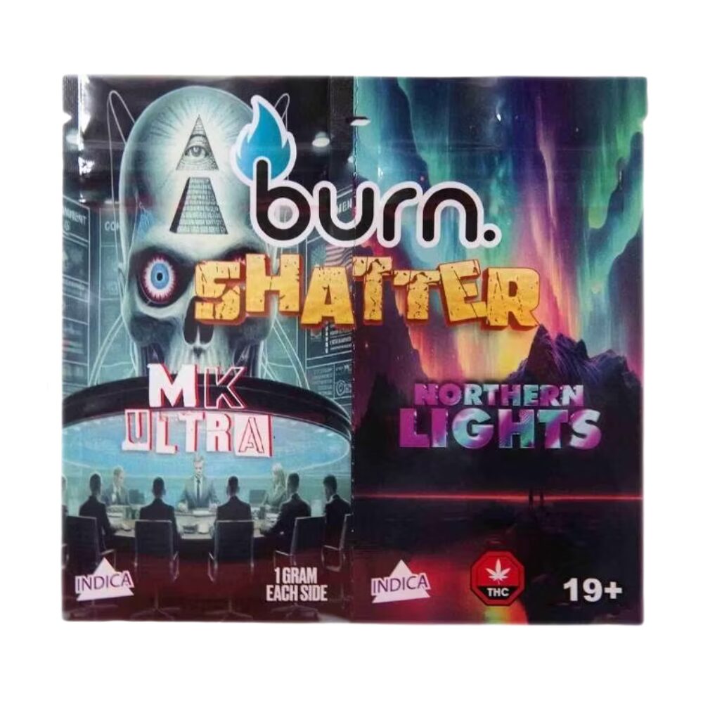 Burn MK Ultra + Northern Lights Shatter combines two powerhouse indica strains for a deeply relaxing experience. MK Ultra brings fast-acting cerebral euphoria and mellow body effects, while Northern Lights adds soothing calm and sedative bliss. With rich earthy and sweet flavours and a smooth, glass-like texture, this premium shatter delivers potent, full-body relief and lasting tranquility. Perfect for evening use, stress relief, and restful sleep.