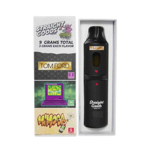 Elevate your session with the Straight Goods – 9g Disposable THC Vape – Tom Ford X Mimosa X Purple Mac, a 9g triple chamber disposable packed with three bold, terpene-rich blends. Each chamber holds 3g of potent Delta-9 THC distillate, giving you a total of 9 grams in one sleek, pocket-friendly pen. Just slide to switch strains and enjoy a tailored high anytime, anywhere.