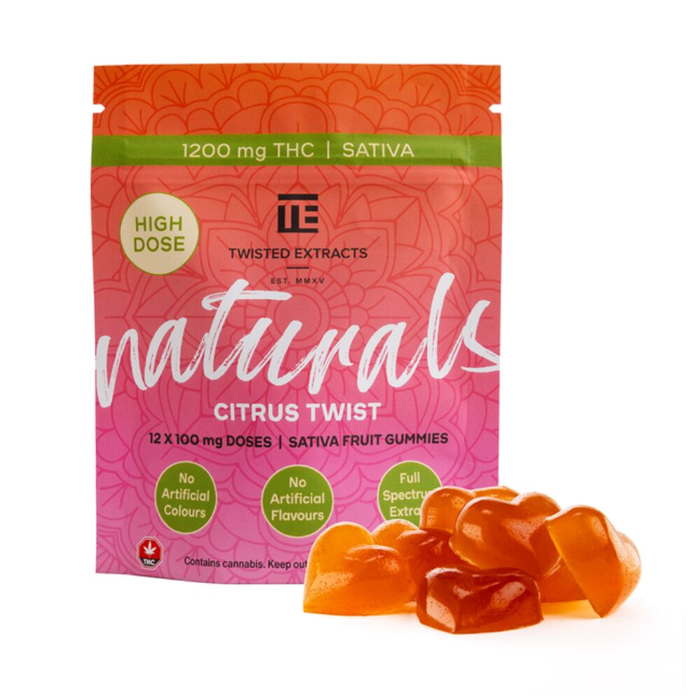 Twisted Naturals Citrus Twist Gummies deliver bright, uplifting sativa effects with a tangy, citrus-forward flavour. Each pack contains 12 fully infused gummies, 100mg each for a total of 1200mg, crafted with natural citrus flavouring and clean ingredients free from artificial colours or flavours. Every piece provides consistent potency, a smooth taste, and reliable daytime elevation.